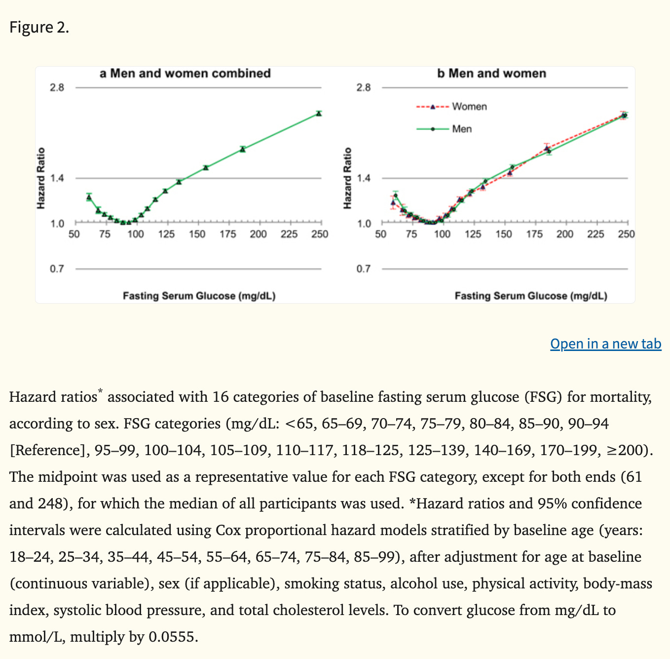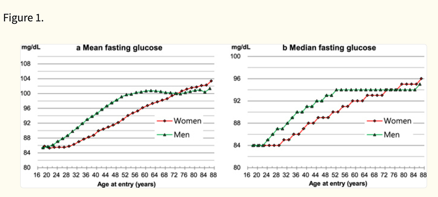 The optimal range of blood glucose for mortality is 80-94 mg/dL (see figure below). The average man has a fasting glucose of >94 starting in his late 30s according to a study. And the average woman has a fasting glucose of >94 starting around age 50. Fasting glucose levels >120 are considered diabetic, so these age-related increases in glucose do not meet criteria for diagnosing diabetes.