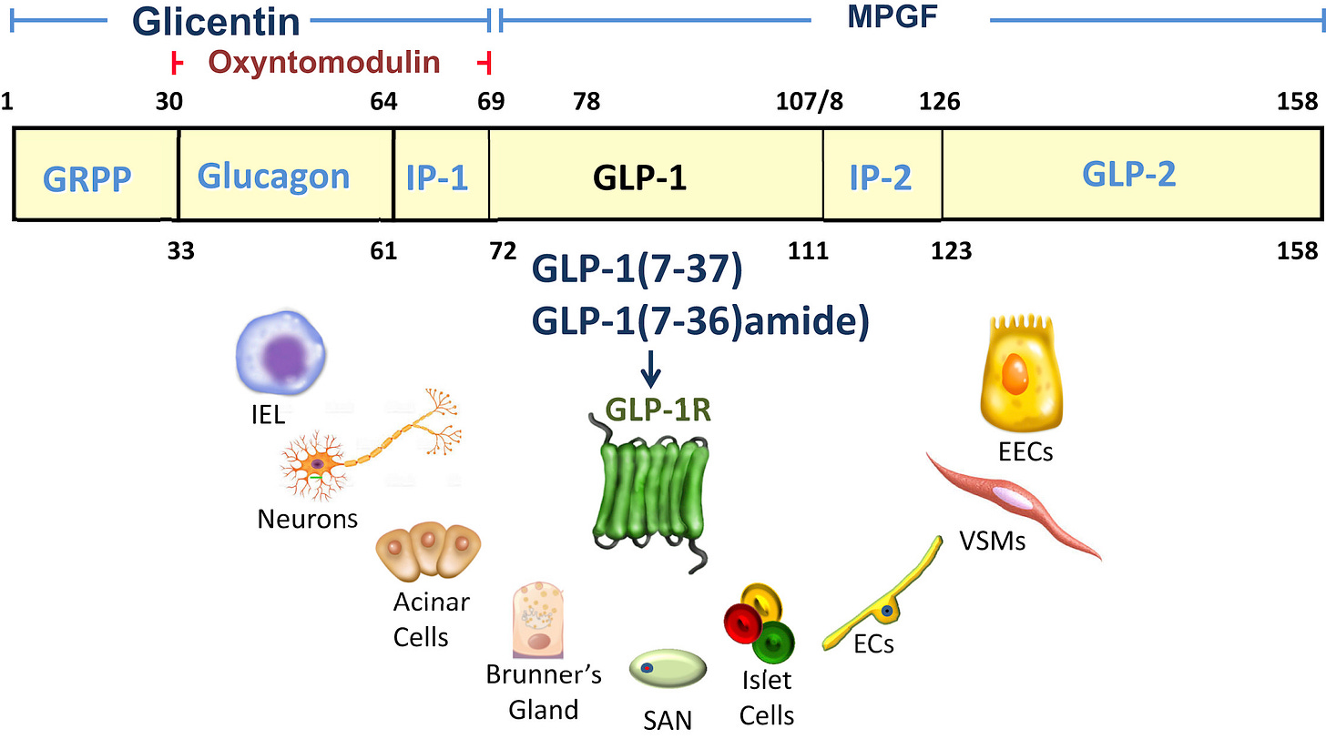 GLP-1 is a circulating peptide hormone produced by your intestine, pancreas (the organ that makes insulin), and neurons. GLP-1RAs are synthetic versions of this protein that are modified to degrade less easily and stick around in your circulation for longer than the GLP-1 that your body makes. GLP-1 has effects on many different cell types in your body including cells in your gut, pancreas, vascular smooth muscle cells that line your arteries, and your neurons.