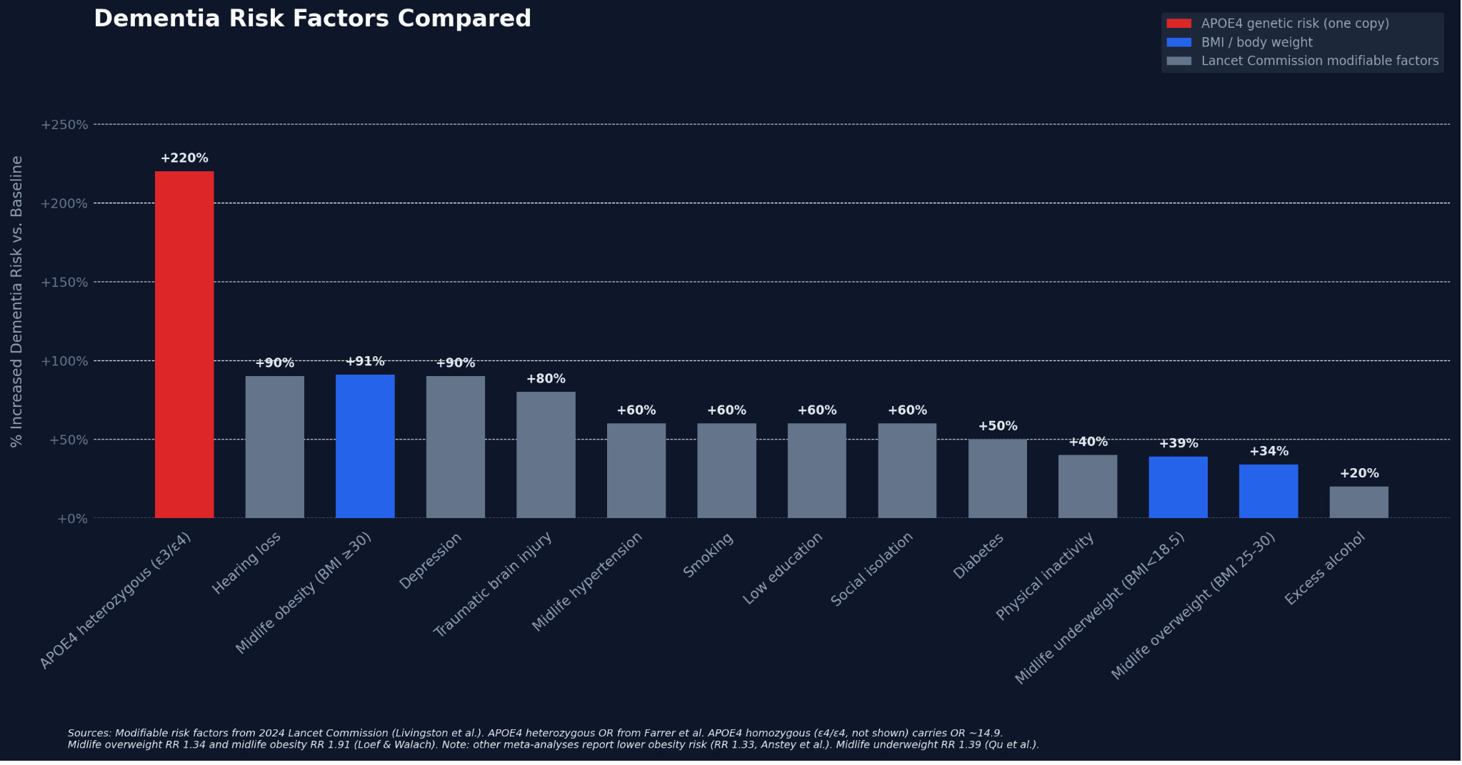 Before diving in, it helps to see where BMI falls relative to other known dementia risk factors. The chart below compares the percentage increase in dementia risk for BMI categories against other modifiable risk factors from the 2024 Lancet Commission and APOE4 genetic risk. Carrying one APOE4 allele (approximately 25% of the population) dwarfs every modifiable factor, with an odds ratio of 3.2. Midlife obesity at +91% (from Loef and Walach; other meta-analyses report +33%) sits among the most impactful modifiable risk factors. Midlife overweight and underweight carry more modest risk (+34% and +39%). The key takeaway: BMI risk is modifiable, and when you stack multiple modifiable factors together, the effects compound.