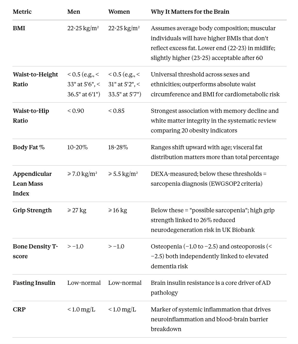 Pulling together the evidence reviewed throughout this article, here are the body composition targets that the current literature suggests are most protective for long-term cognitive health.