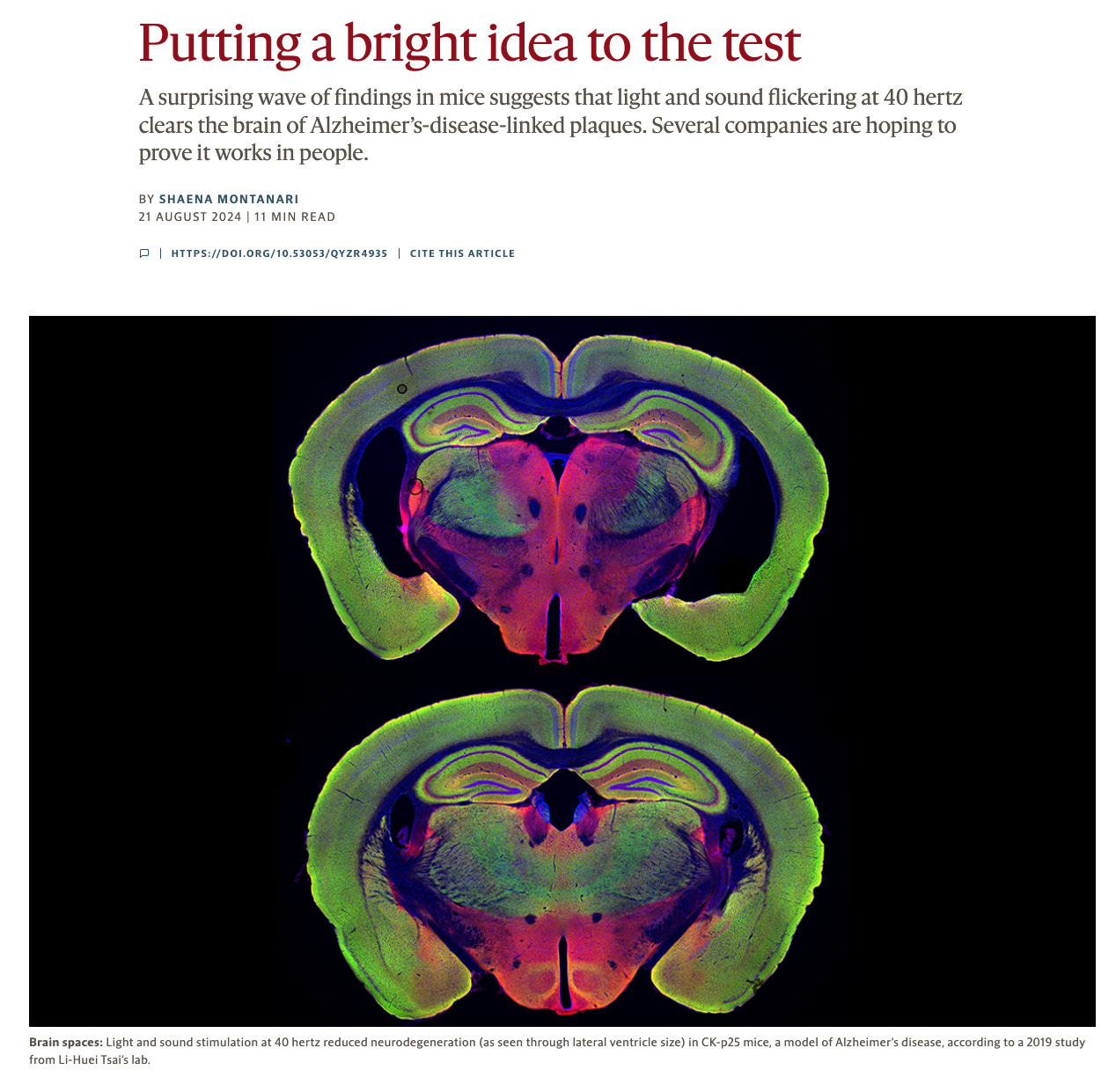 But optogenetics requires brain surgery, which isn’t ideal for a consumer product. So the team asked whether they could get the same gamma entrainment using something external, something that did not require cutting open the skull. They tried flickering a light at 40 Hz and found that mice exposed to the strobe showed the same amyloid reduction in the visual cortex. That 2016 Nature paper launched an entirely new field of research, and within months, Dr. Tsai and MIT neuroscientist Dr. Ed Boyden co-founded Cognito Therapeutics to see if the approach could work in humans.