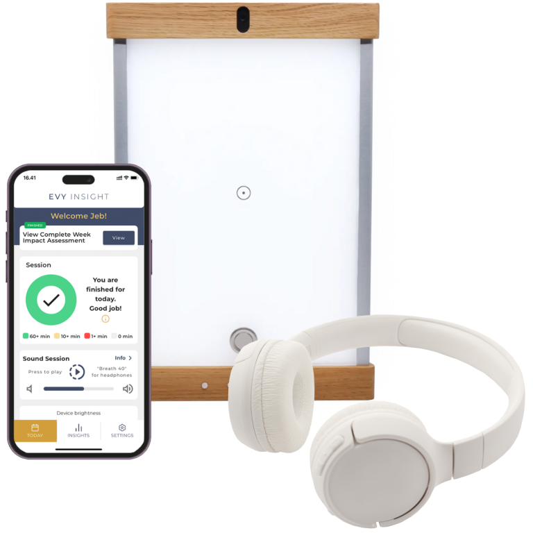 In practice, EVY is a compact, portable light panel that you plug into a wall outlet and place on a flat surface 1.5 to 3 feet away. The light needs to be in your field of vision, but you do not need to stare directly at it. You go about your normal activity for at least one hour, eat breakfast, drink coffee, read, watch TV, or work at a computer. The light is dim and gentle enough that most people describe it as unremarkable. A companion smartphone app (EVY Insight, available for iOS and Android) lets you adjust brightness, play a 40 Hz audio track called “Breath 40” through your own headphones for combined light-and-sound stimulation, and track your daily usage. OptoCeutics recommends morning or early afternoon sessions and daily consistency for the best results. The onboarding process includes a call with a dedicated team member who walks you through setup.