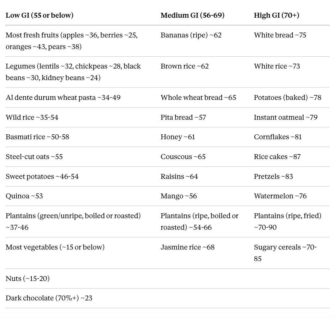A note on glycemic index (GI). The GI ranks carbohydrate-containing foods on a scale of 0 to 100 based on how quickly they raise blood sugar compared to pure glucose. Low-GI foods (55 or below) include most fruits, legumes, and intact whole grains. Medium-GI foods (56 to 69) include some whole grain breads and brown rice. High-GI foods (70 and above) include white bread, most white rice, and potatoes. The GI of a food changes depending on how it is processed and what you eat it with. Steel-cut oats have a GI of about 55; instant oatmeal comes in at 79. Adding protein, fat, or fiber to a carb-heavy meal lowers the overall glycemic response.