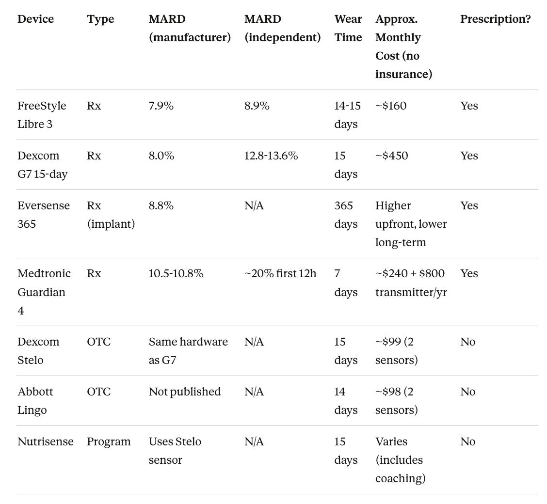 On cost, the FreeStyle Libre 3 is the most affordable prescription CGM at ~$160/month, while the Dexcom G7 runs ~$450/month. For my readers who don’t have diabetes and just want to understand their metabolic patterns, the OTC options are more practical. The Dexcom Stelo at ~$99/month and the Abbott Lingo at ~$98/month, both FSA/HSA eligible, no prescription needed. The MARD differences between devices matter for insulin dosing, but for tracking post-meal trends and overall patterns, any of these will give you useful data.