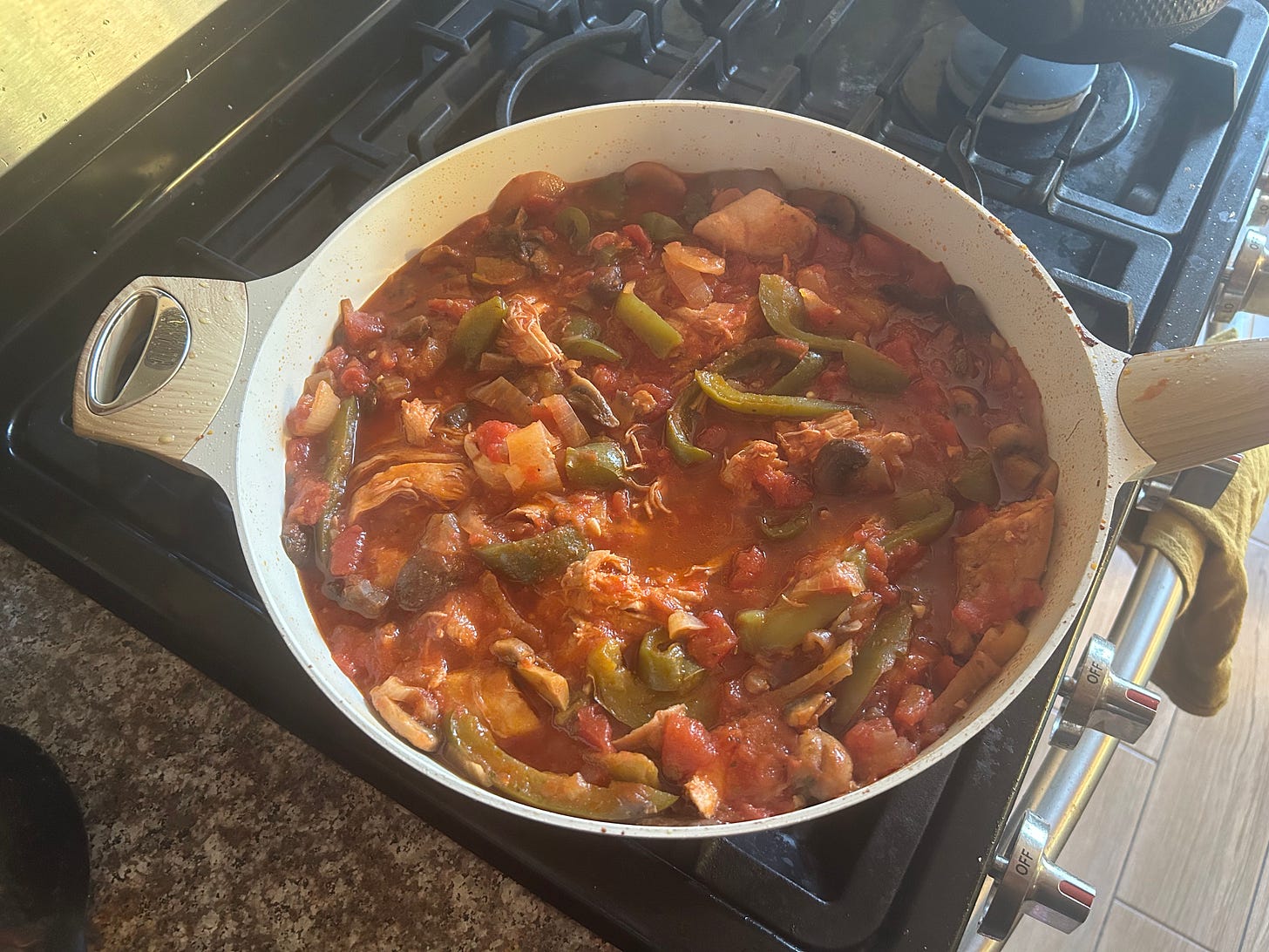 In a large microplastic-free pan brown the chicken on both sides in 3 tbsp olive oil. Add onions on top and stir over medium heat. Add peppers and stir over medium heat. Add the rest of the EVOO, mushrooms and garlic, and stir over medium heat. Add the cans of tomatoes, herbs, salt and pepper. Bring to a slow boil and reduce to low heat and cover. Cook for one hour or until the peppers are very soft and the onions are completely translucent. Roughly tear the chicken in large pieces using a serving spoon. Serve over whole grain rice or with crusty bread. Top with parmesan cheese if desired.