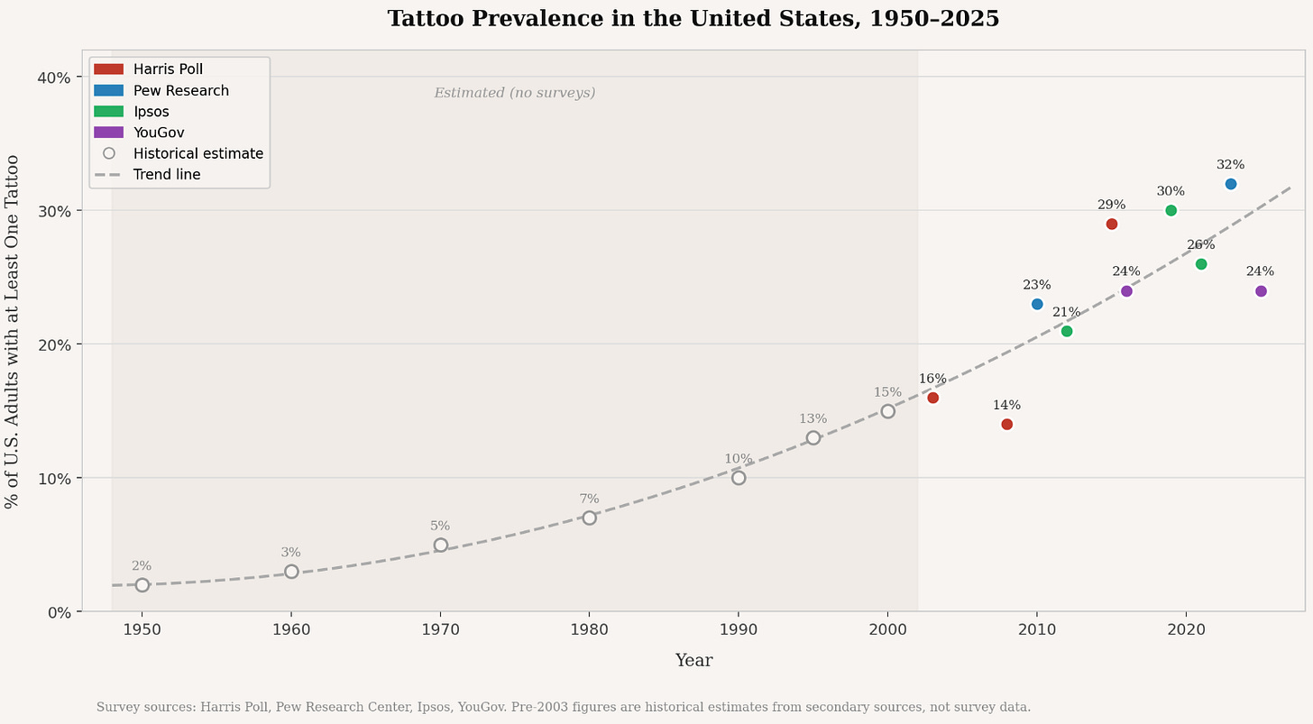 I’m in good company. Roughly one in three Americans now has at least one tattoo, and the prevalence reaches 40% or higher in some European countries among adults under 40.