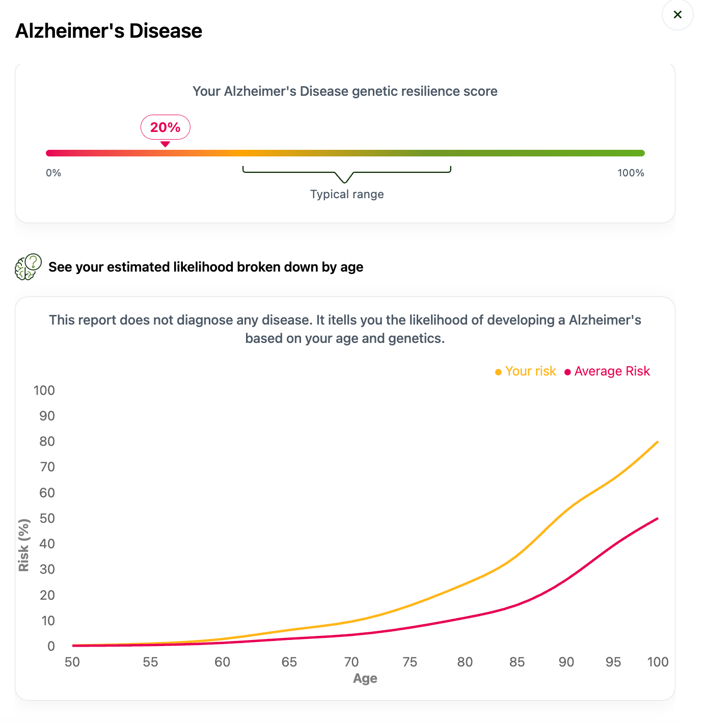 At NeuroAge we test for 41 different typos in genes that together make up people’s risk score for Alzheimer’s Disease. By contrast, 23andMe only tested for one typo in one gene, APOE4. You can think of our testing like a weighted average of all your risk genes that combine into a single score, known as a polygenic risk score (PRS). It’s a bit more complicated than that but this is the general idea. You can see demo data for the genes we test for here.