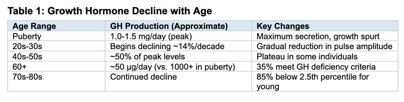 Beginning in early adulthood, growth hormone secretion progressively declines in a phenomenon termed “somatopause.” GH production decreases by approximately 14% per decade (J Clin Endocrinol Metab 1996), or roughly 1-2% per year (Mayo Clin Proc 2021). By age 60, approximately 35% of men meet criteria for GH deficiency, and 85% of healthy men aged 59-98 have IGF-1 levels below the 2.5th percentile for younger men (PMC3940699). This decline is associated with loss of lean body mass, increased adiposity, decreased bone density, and cognitive changes (Endotext 2019).