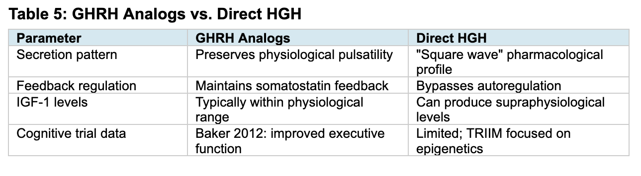 That said, the tesamorelin data represents the strongest evidence for cognitive benefit from any somatotropic intervention in humans. If replicated, it would suggest that GHRH analogs may have a role in cognitive enhancement distinct from direct HGH, possibly through preserved physiological signaling patterns or GABA-mediated mechanisms. This remains an open question requiring further investigation.
