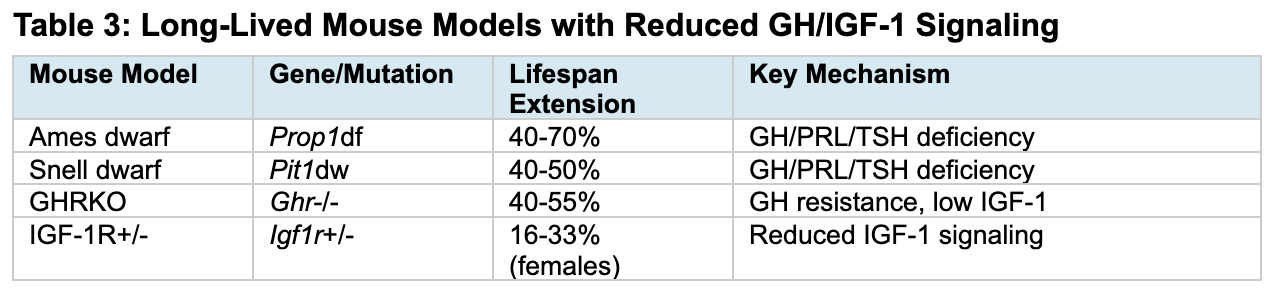 Table 3: Long-Lived Mouse Models with Reduced GH/IGF-1 Signaling