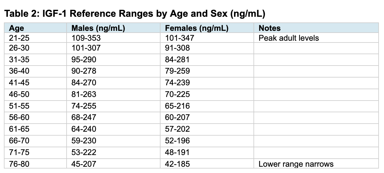 Source: Warde Medical Laboratory reference ranges. Note that reference ranges may vary by assay and laboratory. The median IGF-1 level in healthy 18-year-olds is approximately 374 ng/mL, declining to 180 ng/mL by age 35-39 (48% of peak) and to 93 ng/mL by age 70+ (25% of peak) (PMC5627923).