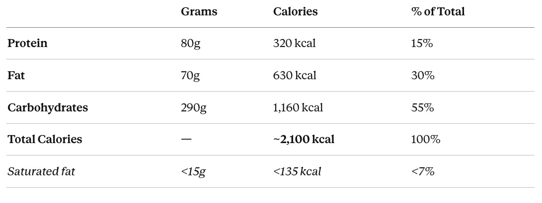 Calories: For a 150 lb person at normal BMI who exercises an hour daily, maintenance falls roughly in the 2,000-2,200 range depending on the type of exercise and baseline metabolism. I’m using 2,100 as a reasonable midpoint.