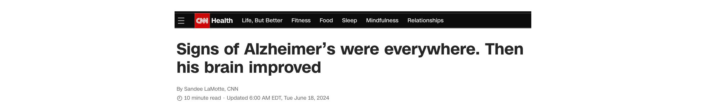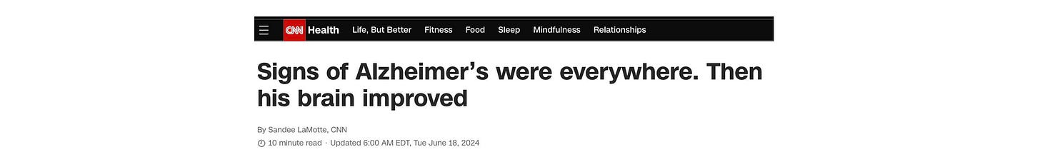 An entrepreneur in his 50s in Florida who is at high genetic risk of Alzheimer’s disease (two copies of the APOE4 allele) tested positive for amyloid, the toxic protein that builds up during Alzheimer’s, by blood test and brain scan. He underwent intense lifestyle changes with diet and exercise and was able to then test negative for amyloid.