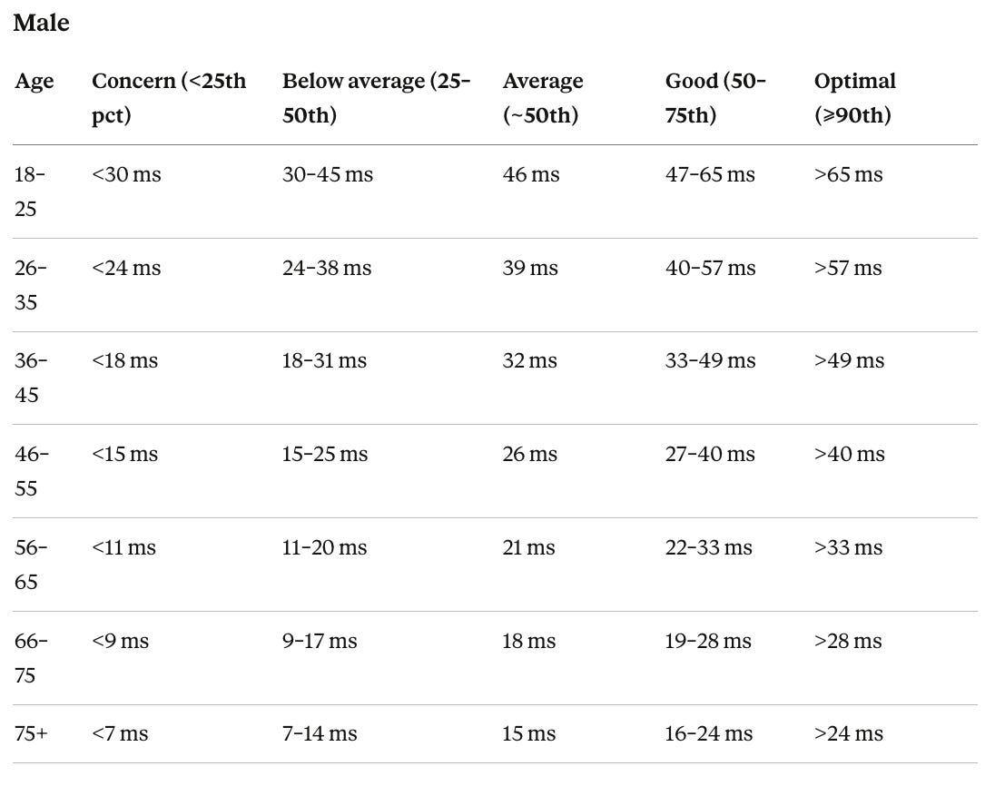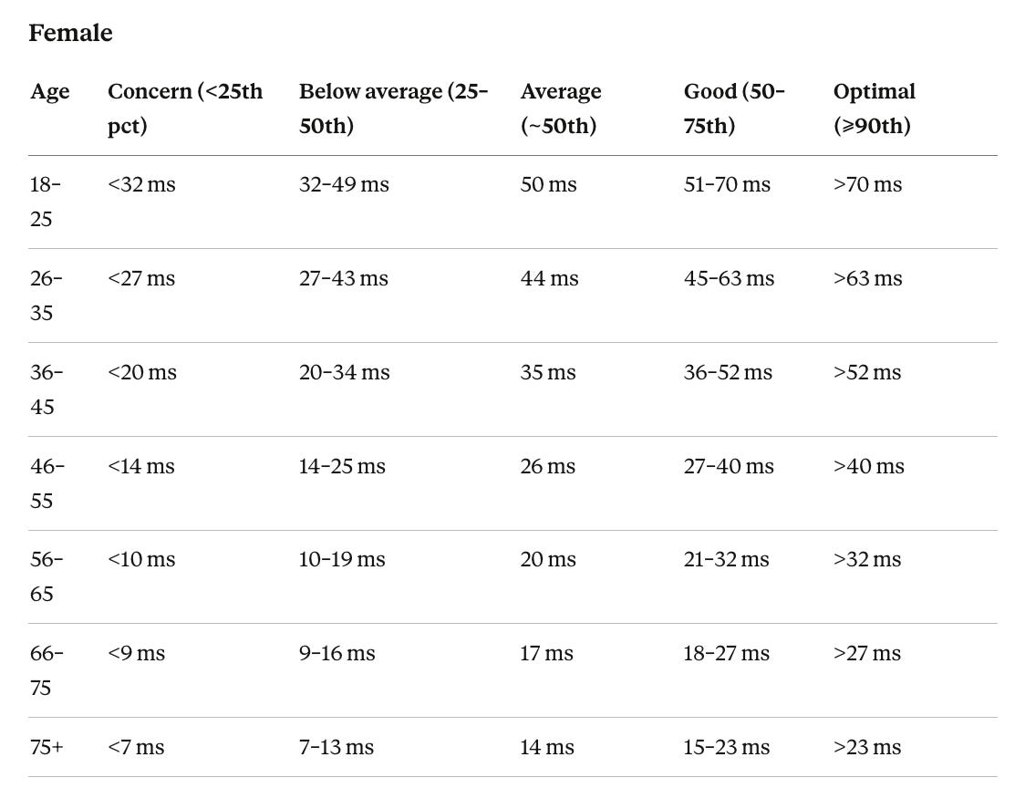 The benchmarks below are drawn from published population studies including the Lifelines Cohort Study and the Baependi Heart Study. Women in reproductive years run slightly higher RMSSD than men of the same age, driven by estrogen’s enhancing effect on vagal tone. This advantage narrows after menopause and largely converges above age 60.