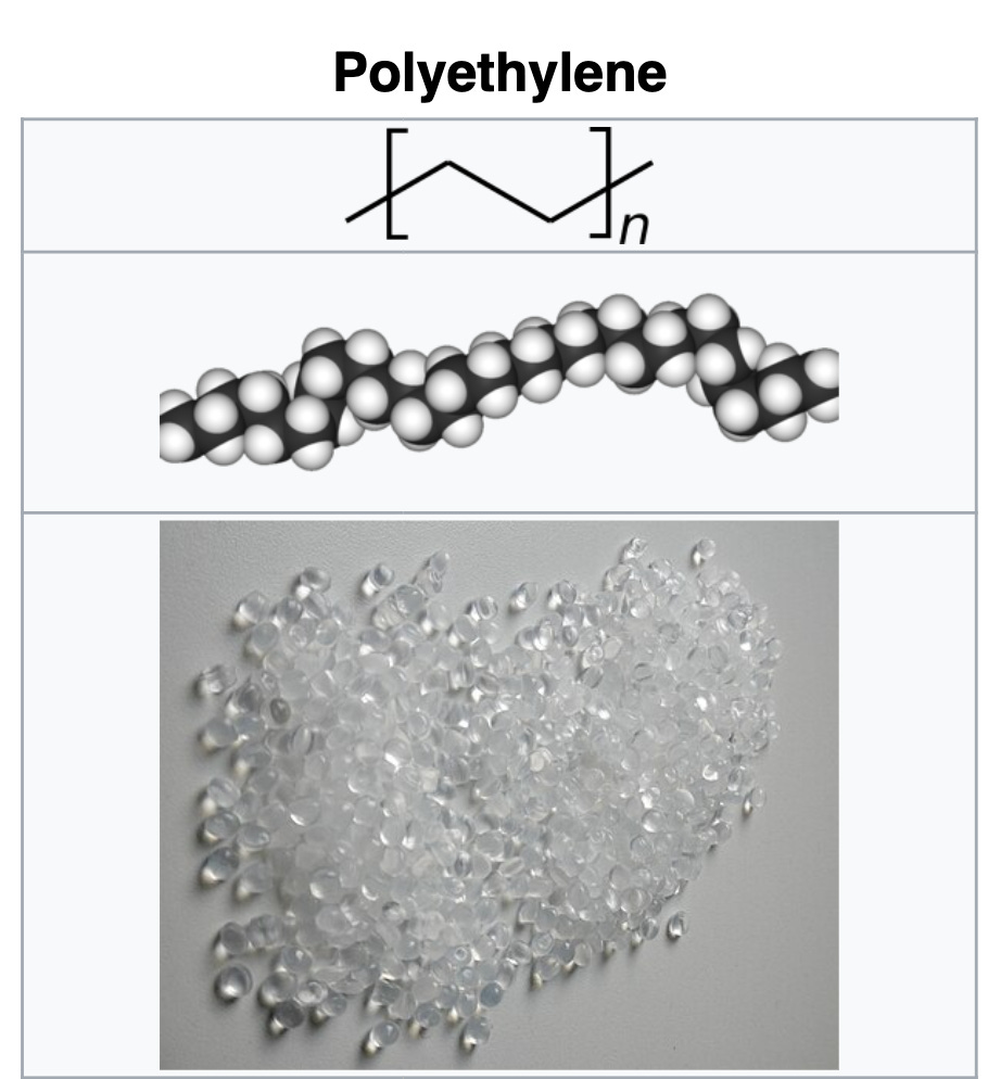 ”Polyethylene or polythene (abbreviated PE; IUPAC name polyethene or poly(methylene)) is the most commonly produced plastic.[7] It is a polymer, primarily used for packaging (plastic bags, plastic films, geomembranes and containers including bottles, cups, jars, etc.). As of 2017, over 100 million tonnes of polyethylene resins are being produced annually, accounting for 34% of the total plastics market.”