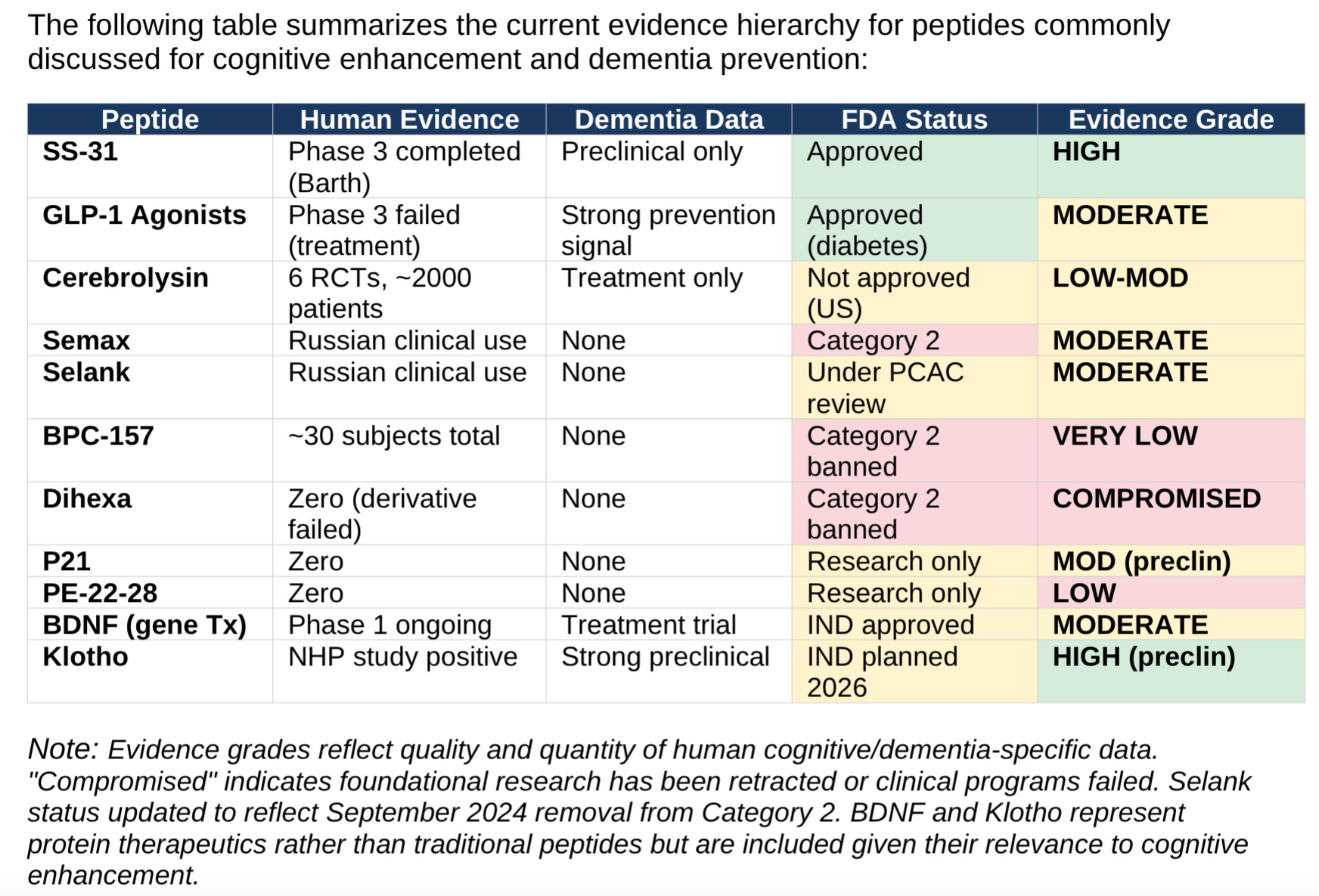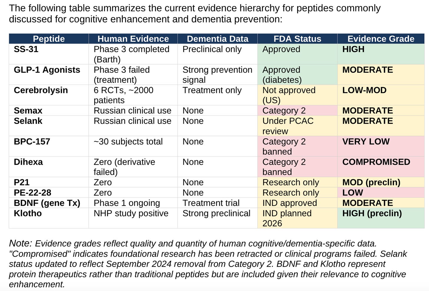 I personally err on the side of caution for myself given that I am relatively young and doing pretty well with my cognition and brain aging. The only peptide that I take amongst these is a microdose of a GLP1-RA (0.5mg of Semaglutide). This is because of its FDA approval and 10+ year safety profile as well as multiple proven benefits for metabolism and cardiovascular risk with speculative/accumulating evidence for dementia prevention. No other peptide meets my own criteria for risk/benefit tradeoff.