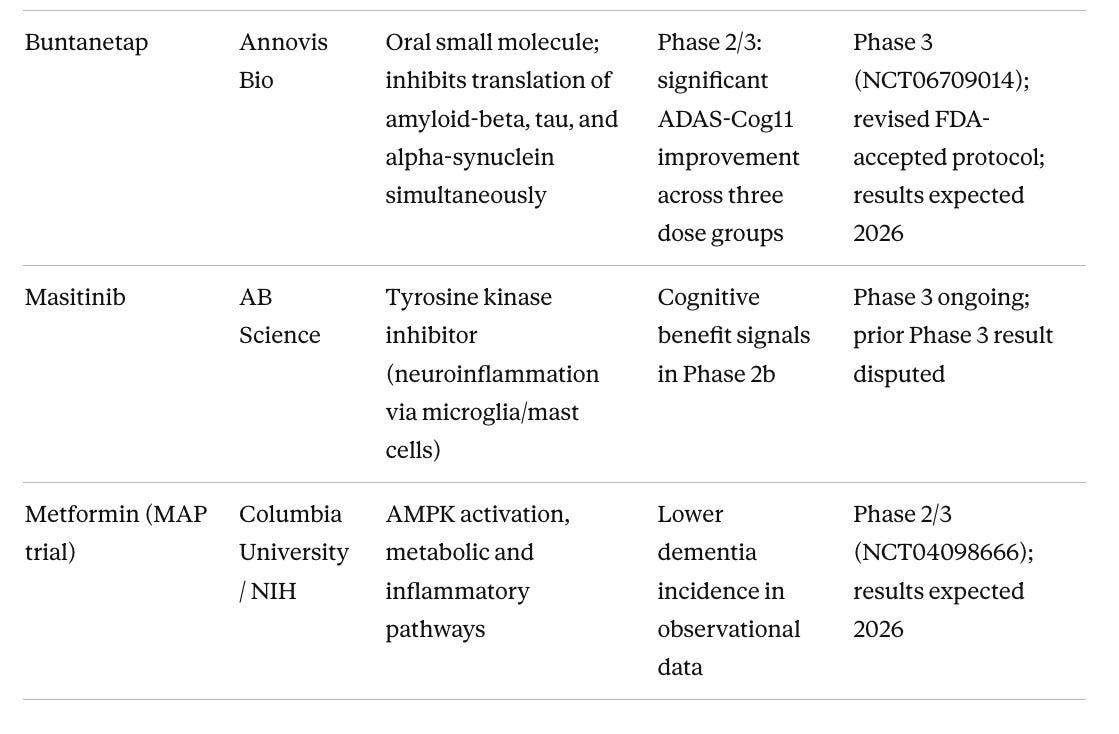 Buntanetap (Annovis Bio) is the only drug in Phase 3 targeting amyloid-beta, tau, and alpha-synuclein translation simultaneously via a single oral small molecule. The Phase 2/3 dose-ranging study showed statistically significant ADAS-Cog improvements across three dose groups, which is a cleaner signal than most oral small molecule programs have produced. It reduces synthesis of all three aggregating proteins at the ribosomal level rather than targeting the aggregates themselves, an upstream approach that is disease-agnostic across multiple neurodegenerative conditions. Results in 2026 will be important for understanding whether the multi-target oral approach can replicate in a larger population.