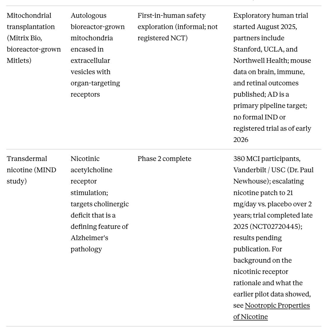 Stem cell therapies represent a distinct category worth watching. I have covered the broader stem cell landscape for neurodegeneration in a recent Substack post, including why Parkinson's has been an easier target than Alzheimer's and what that means for the field. The most clinically advanced program is laromestrocel (Longeveron), a bone marrow-derived allogeneic MSC therapy whose Phase 2a RCT published in Nature Medicine in March 2025 met its primary safety endpoint and showed trends toward reduced brain atrophy and slowed cognitive decline at the highest dose. The drug appears to work via anti-inflammatory paracrine mechanisms rather than cell replacement. A separate Phase 1 of autologous adipose-derived stem cells (RB-ADSCs, Regeneration Biomedical) reported positive interim safety and early efficacy signals at ISCT 2025. iPSC-derived neural cell approaches, which would replace lost neurons rather than modulate inflammation, remain a longer horizon but are advancing. The appeal of the whole category is that it does not attempt to hit a single molecular target in a heterogeneous disease. Instead, it tries to restore the biological environment that allows neurons to survive.