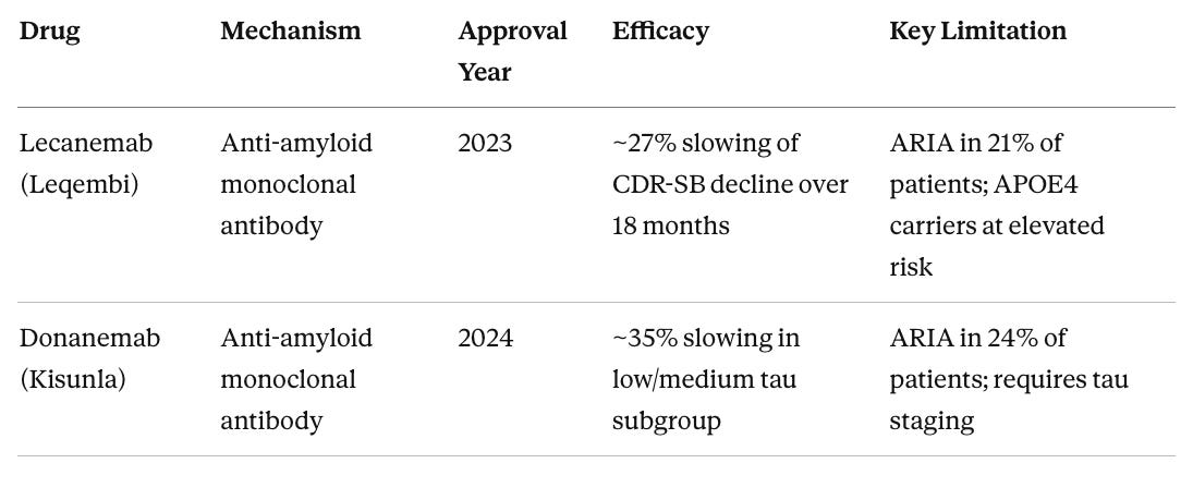 Both approvals are meaningful proof of concept that removing amyloid from the brain can influence disease trajectory. But the effect sizes are modest, the patient populations are narrow (early symptomatic disease with confirmed amyloid), and APOE4 carriers face a troubling catch in that those at highest genetic risk may be least suitable for the currently available treatments due to elevated ARIA risk.
