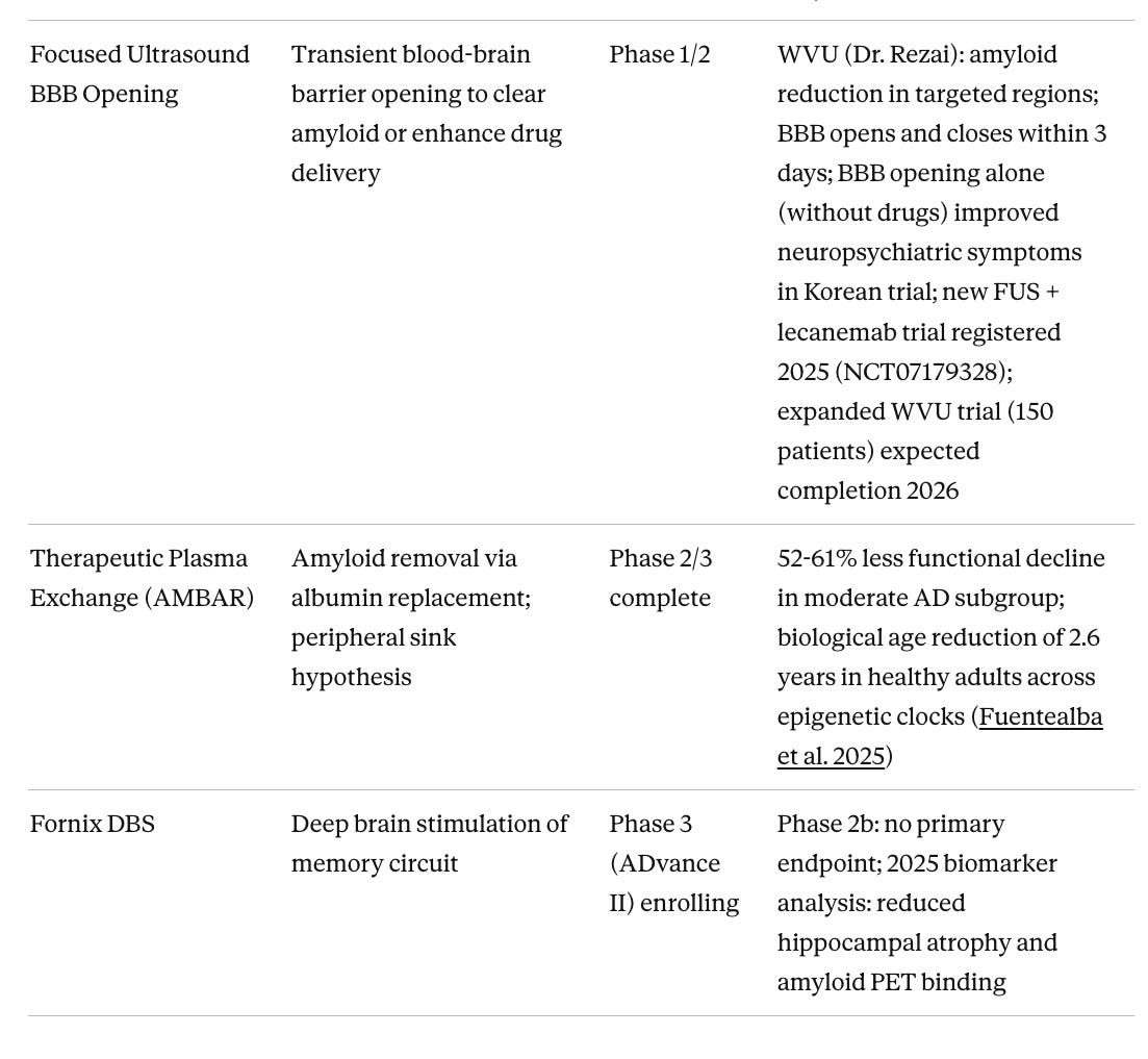 Focused ultrasound BBB opening may turn out to be important as the delivery technology that makes anti-amyloid antibodies work substantially better. Current approved antibodies penetrate the brain poorly, requiring high doses that drive ARIA risk. FUS transiently opens the blood-brain barrier for 48–72 hours with a non-invasive procedure, potentially allowing far lower antibody doses to achieve the same clearance. Dr. Ali Rezai’s program at West Virginia University has shown 14% amyloid reduction in targeted regions from BBB opening combined with aducanumab, a modest signal but from a trial not designed or powered to show cognitive change. The Korean trial of BBB opening alone, without any drug, and repeated bilateral frontal FUS improved neuropsychiatric symptoms, suggesting that clearing pro-inflammatory signals and toxic aggregates through mechanical BBB disruption may itself be therapeutic. A new trial combining FUS with lecanemab (NCT07179328) was registered in 2025 and represents the next logical test of whether the delivery enhancement hypothesis holds in a properly designed study. The WVU program at Rockefeller Neuroscience Institute is the most active US site, with contact information at wvumedicine.org/rockefeller-neuroscience-institute.