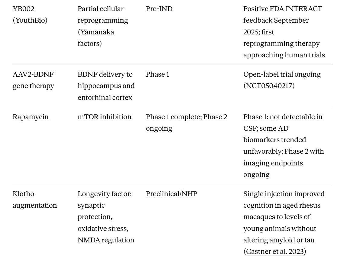 Partial cellular reprogramming has moved from preclinical promise to first-in-human testing faster than most of the field expected. Life Biosciences, co-founded by Dr. David Sinclair at Harvard, received FDA IND clearance in January 2026 and initiated Phase 1 of ER-100 (NCT07290244), a gene therapy using three Yamanaka factors (OCT4, SOX2, KLF4) to partially reprogram aged retinal cells, in patients with glaucoma and non-arteritic anterior ischemic optic neuropathy. This is the first human trial of partial epigenetic reprogramming anywhere. The first indication is the eye, which is a part of nervous system, and the same platform is being developed for neurodegeneration and other age-related diseases. For Alzheimer's specifically, YouthBio's YB002 received positive FDA INTERACT feedback in September 2025 and remains the most advanced reprogramming program targeting the brain, though it is still several years from a clinical trial. Mouse model data showing reversed epigenetic aging signatures, reduced amyloid plaques, and improved cognition are compelling, and Life Biosciences' human safety data from the eye trial will inform what is possible in the central nervous system.