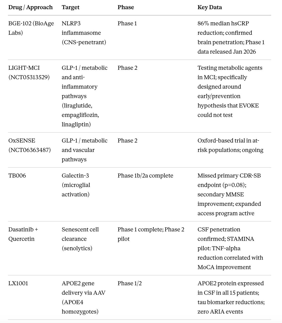 The GLP-1 story is not closed. The liraglutide ELAD trial also missed its primary endpoint, but predefined secondary outcomes showed nearly 50% less brain volume loss and 18% slower cognitive decline, signals built into the trial design, not post-hoc, that raise legitimate questions about whether FDG-PET metabolic rate was the right primary endpoint for a drug acting through trophic and inflammatory mechanisms. (Edison et al. 2025) Two ongoing trials are testing the prevention hypothesis directly: LIGHT-MCI (NCT05313529) and OxSENSE (NCT06363487), both designed specifically for the earlier population that EVOKE could not address. Whether injectable GLP-1 formulations with higher CNS bioavailability, or combination approaches layered on top of amyloid clearance, produce different results remains an open and scientifically legitimate question.
