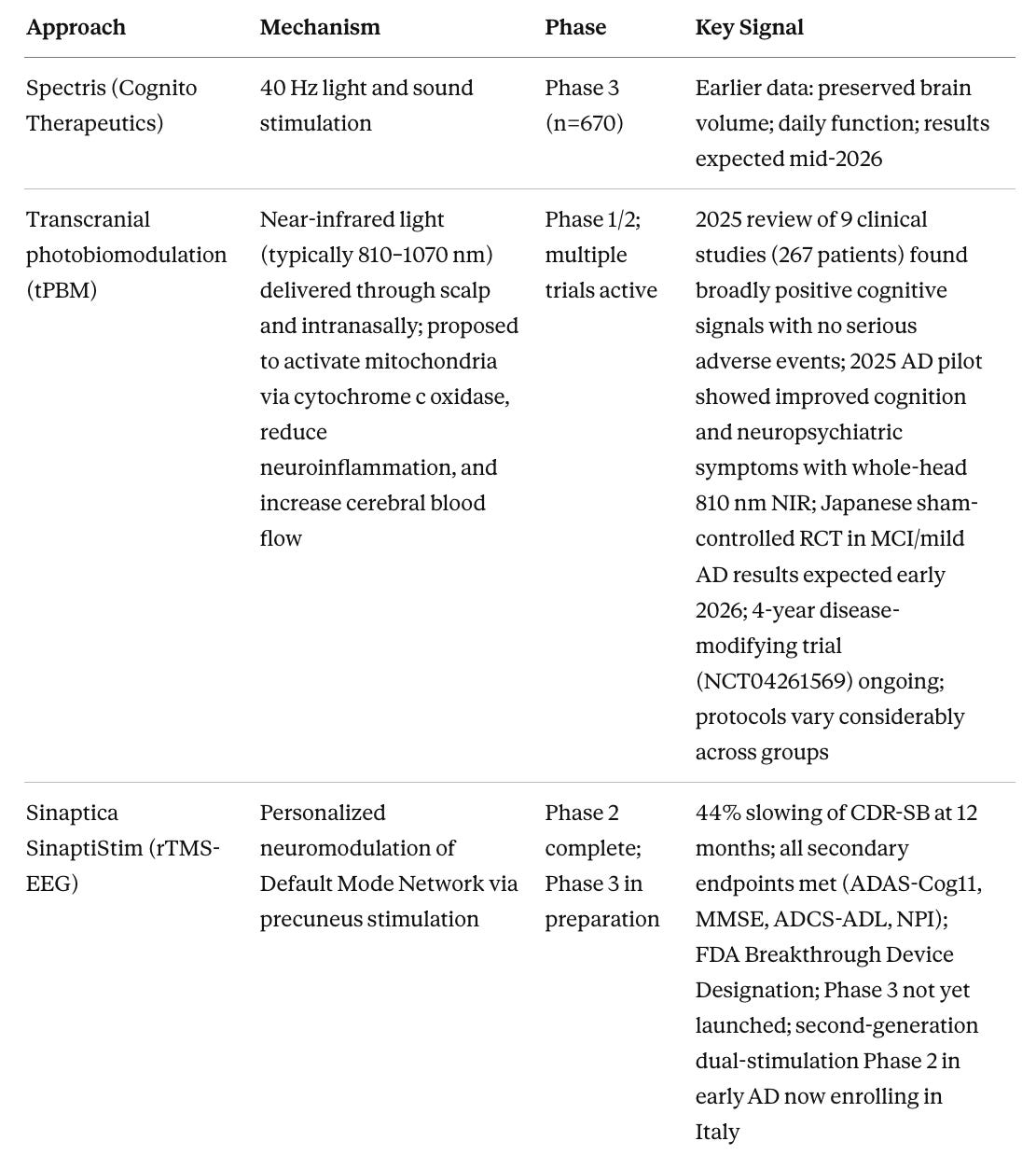Sinaptica’s personalized rTMS is a device program that I think has a good chance of demonstrating real efficacy at scale. I have written about TMS at length on my Substack. The Phase 2 data show 44% slowing of CDR-SB over 12 months, with statistically significant improvements across cognition, daily function, and behavioral disturbances, and no serious side effects. The key distinction from earlier TMS programs is personalization, meaning calibration to each individual’s brain anatomy and connectivity using MRI, TMS-EEG, and neuronavigation, so that stimulation actually reaches the intended target. Phase 3 has not yet launched as of early 2026, but FDA Breakthrough Device Designation is in place and active preparations are underway. A second-generation system combining TMS with transcranial electrical stimulation is now being tested in early AD in Italy, with a 70% reduction in session time. To express interest in Sinaptica’s trial program, contact the company through sinapticatx.com or media contact Kathryn Morris at kathryn@brightpointny.com.