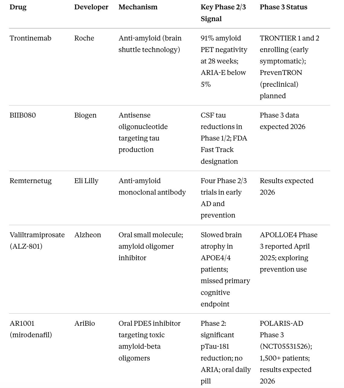 Trontinemab has the most compelling near-term profile in the treatment category. The mechanism is proven. Lecanemab and donanemab already established that amyloid clearance influences disease trajectory. Trontinemab’s advantage is in delivery. Its brain shuttle technology achieved 91% amyloid PET negativity at 28 weeks, compared to roughly 70% for lecanemab at 18 months, with ARIA-E rates below 5% versus 13-24% for approved therapies. For APOE4 homozygotes, who currently have almost no treatment options due to elevated ARIA risk, this could be the first viable anti-amyloid option.