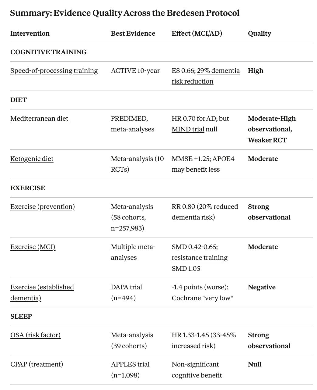 Below are a few interventions have RCT or strong observational evidence but receive little emphasis in multimodal protocols like Bredesen’s. There are many more interventions that he didn’t test that could have efficacy.
