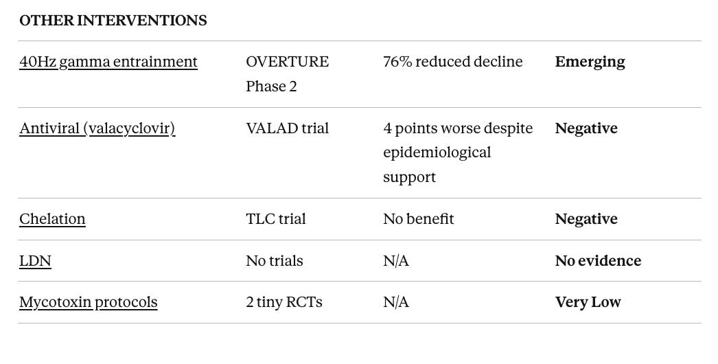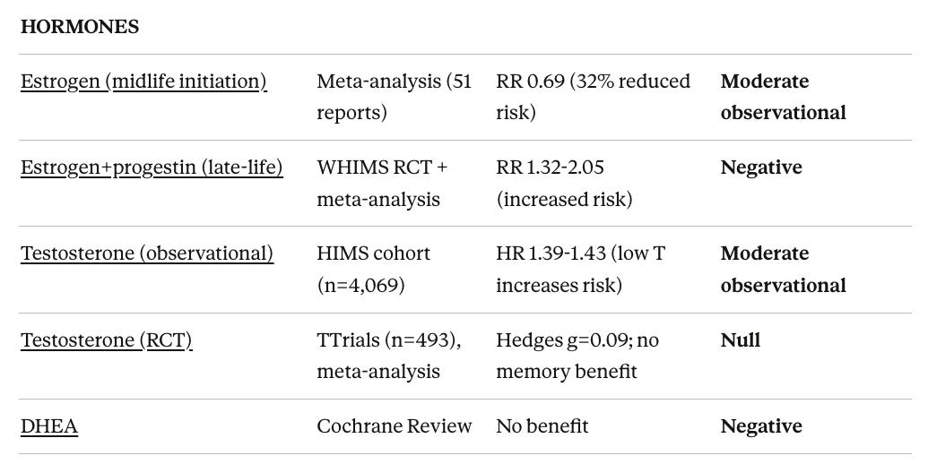 Null or negative evidence: CPAP for cognition (despite strong sleep apnea-dementia association), vitamin D supplementation (despite strong observational links), late-life hormone replacement (increased dementia risk), testosterone replacement (no cognitive benefit despite observational associations), valacyclovir (worsened outcomes), chelation, DHEA