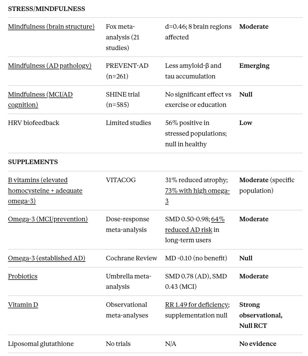 Moderate evidence for specific populations: Exercise in MCI (but harmful in established dementia), B vitamins for elevated homocysteine (but only with adequate omega-3), omega-3s in MCI (but not AD), ketogenic diet, probiotics