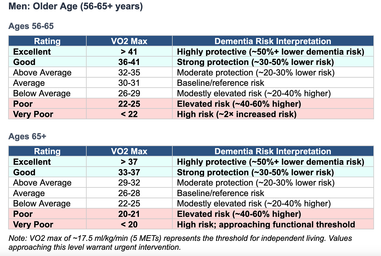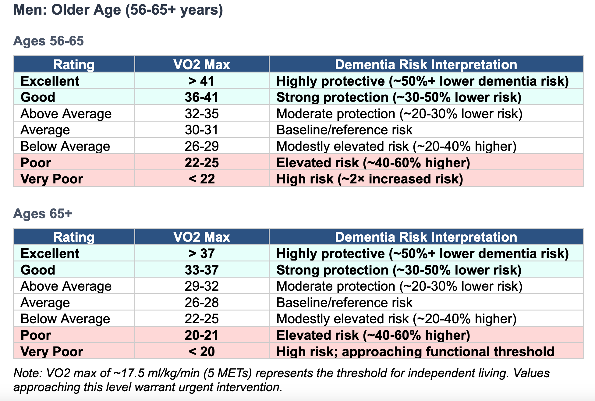 The following tables integrate population norms with dementia risk data to provide actionable thresholds for clinical decision-making. Risk interpretations are derived from the Finnish Kuopio study (men) and Swedish cohort study (women), where each ~3.5 ml/kg/min increase corresponds to approximately 20% lower dementia risk.