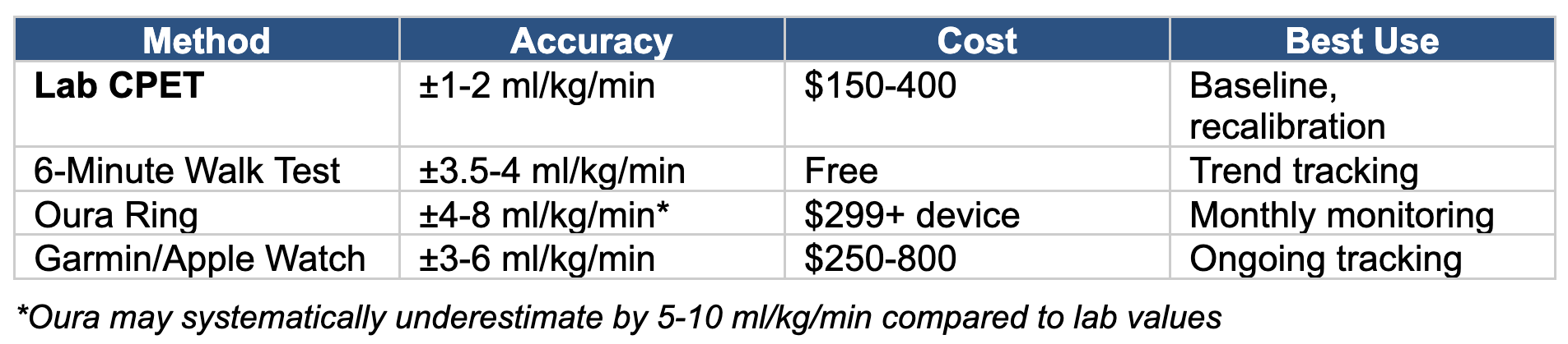 Given the powerful dose-response relationship between cardiorespiratory fitness and dementia risk, accurate measurement of VO2 max becomes clinically important for risk stratification and tracking improvement over time. Testing options span a wide range of accuracy, accessibility, and cost.