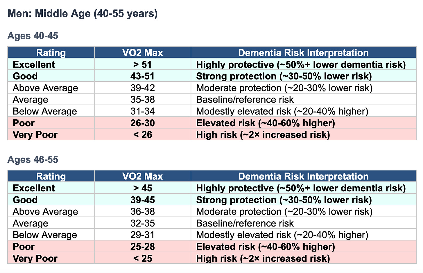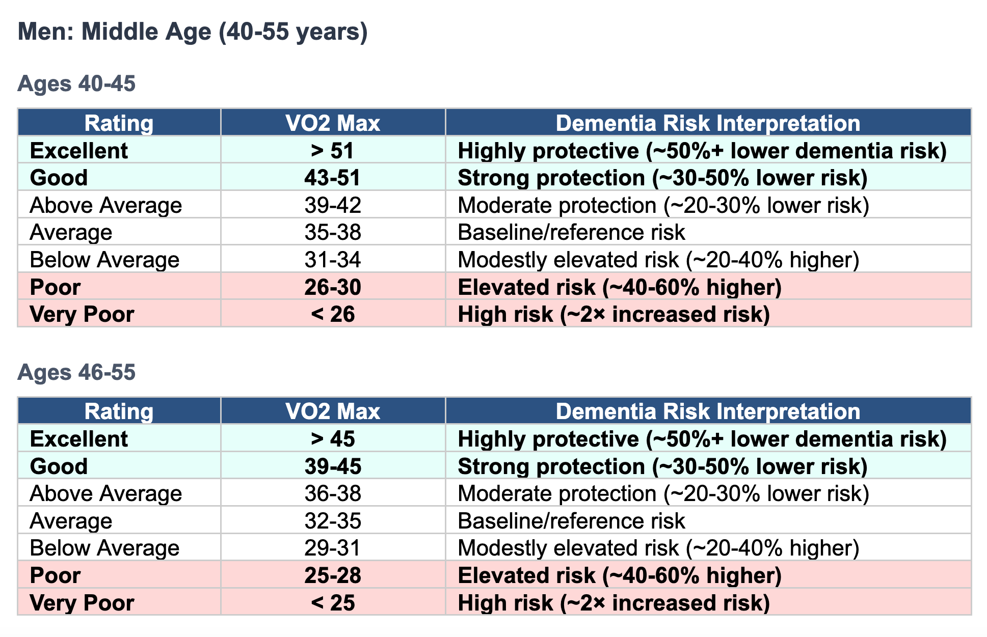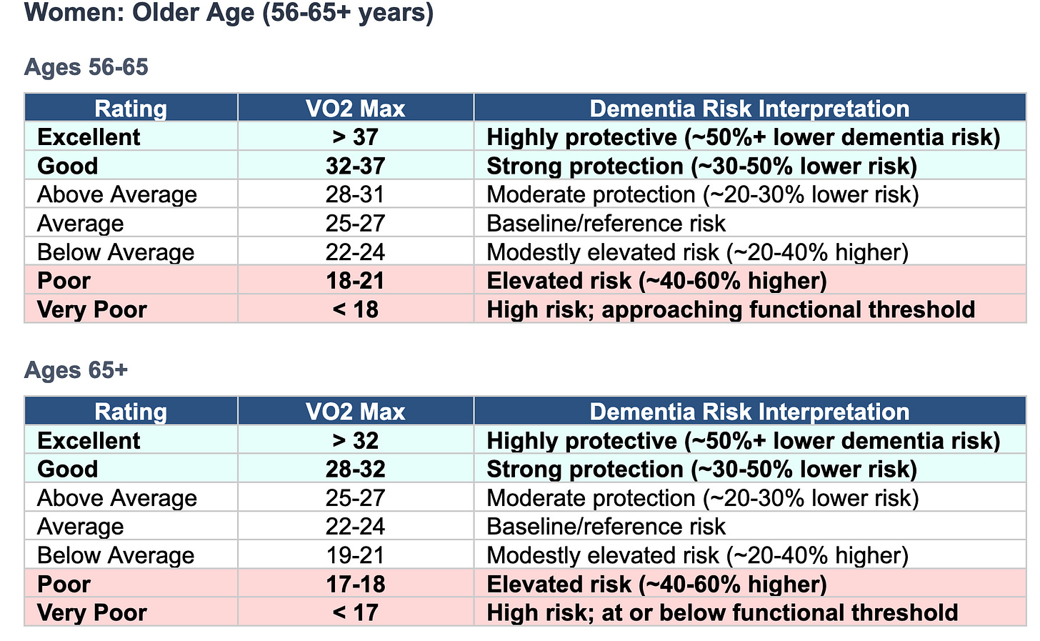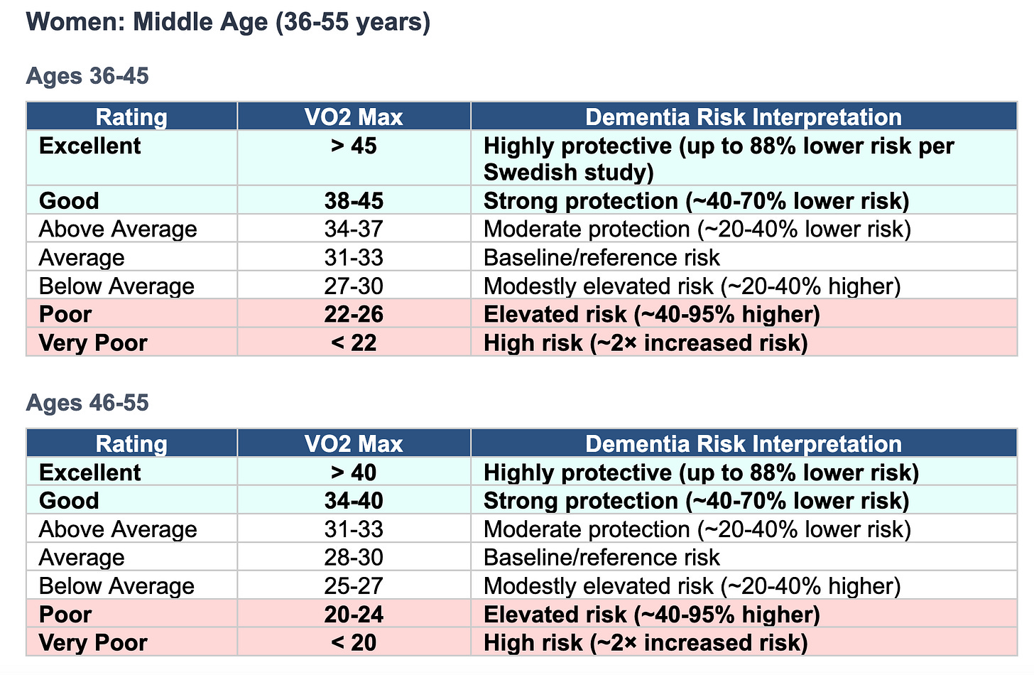 Target zone: For optimal brain protection, aim for the “Good” or “Excellent” category for your age and sex. This corresponds to the top quartile of fitness for your demographic and is associated with approximately 30-50% lower dementia risk (or up to 88% in the Swedish women’s study).