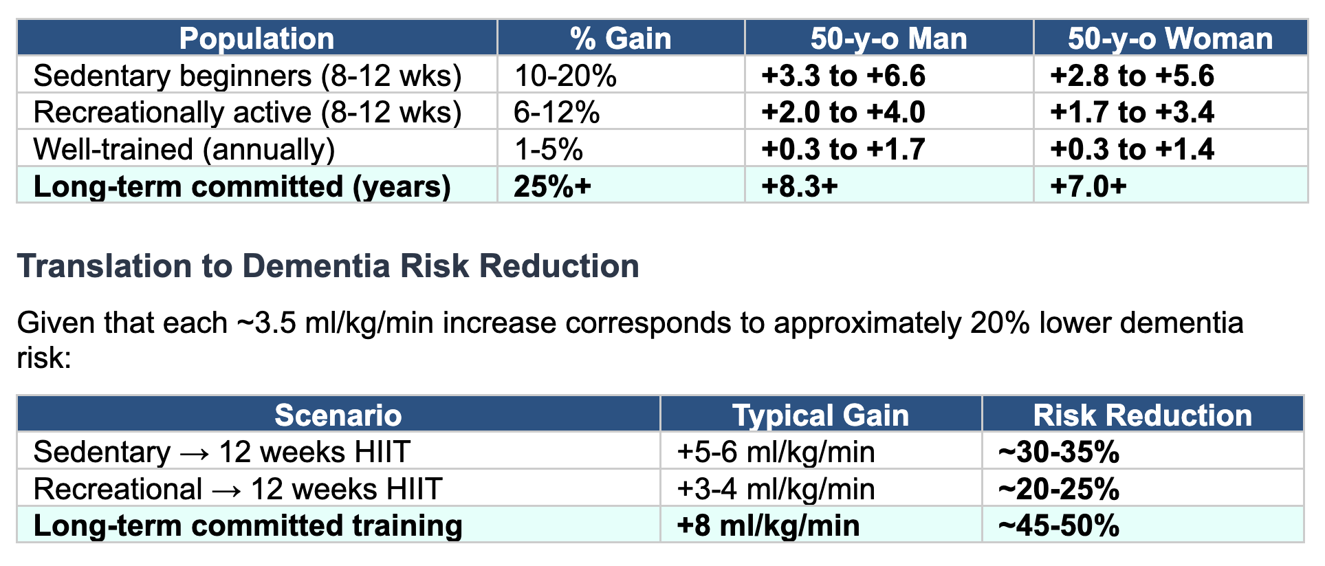 The following table translates percentage improvements into absolute values (ml/kg/min) for typical 50-year-old adults, using average baseline values of 33 ml/kg/min for men and 28 ml/kg/min for women:
