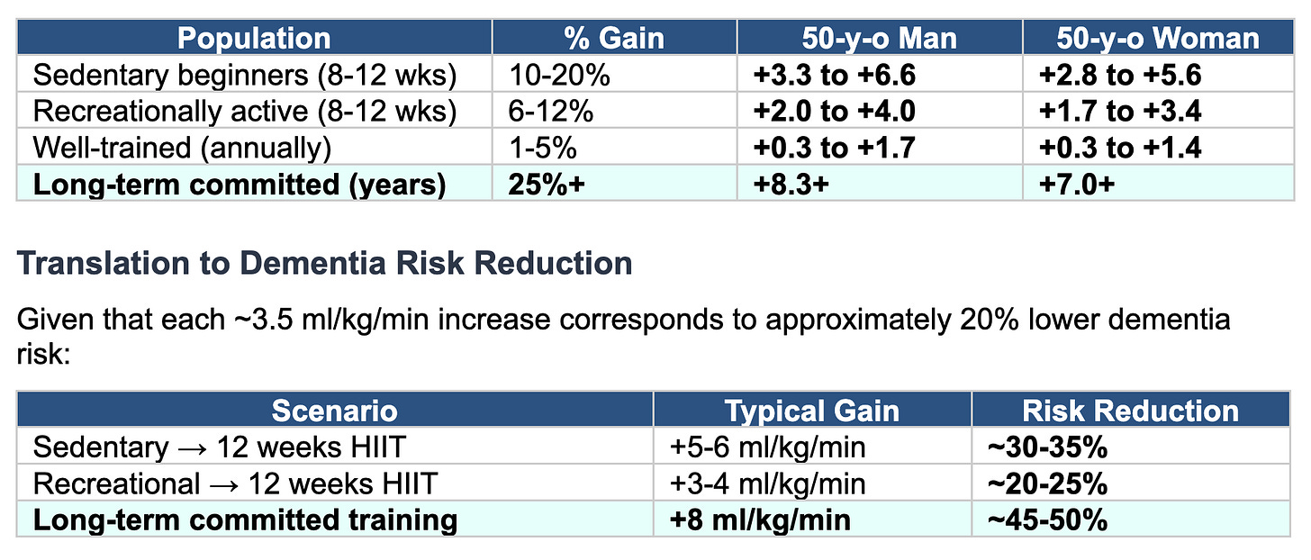 Trajectory matters: The HUNT study showed that improving from “unfit” to “fit” categories produced a 48% dementia risk reduction, even in those who weren’t always fit. It is never too late to benefit from improved cardiorespiratory fitness.