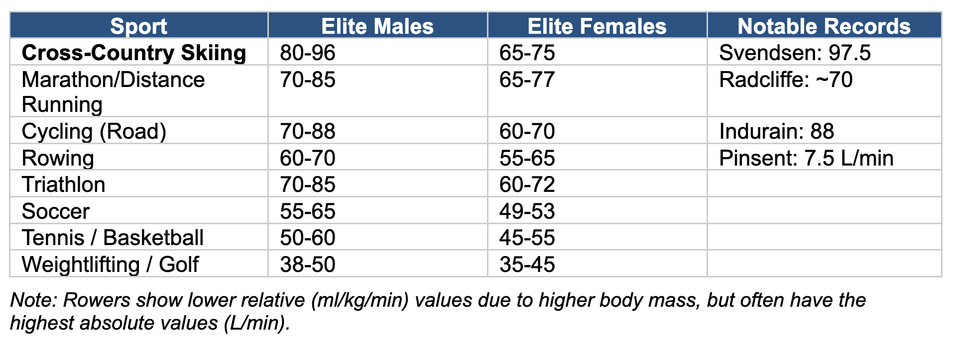 To provide context for interpreting VO2 max values, the following table shows typical ranges for elite athletes across different sports. Cross-country skiers consistently achieve the highest values because the sport demands simultaneous upper and lower body engagement, maximizing total muscle oxygen utilization.