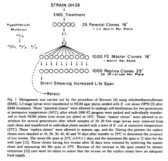 Bottom-up approaches to identifying longevity genes first started in the 1970s and 1980s. Below is a paper from Michael Klass from 1983 showing a now classical technique for “screening” the worm, C. elegans, for lifespan extension. The premise of these experiments is to mutate every gene in these worms, one by one, and see if any of the worms live longer.